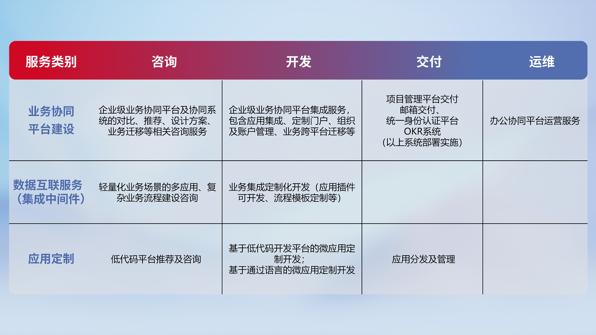 针对钉钉、、企微、、IDaas等平台级产品提供产品的规划、、、方案、、、交付、、、、定制化开发等服务,,,,实现如统一协同办公、、、智能客户服务、、混合会议管理、、、、智能数据查询、、等业务场景,,实现数字化转型。。。