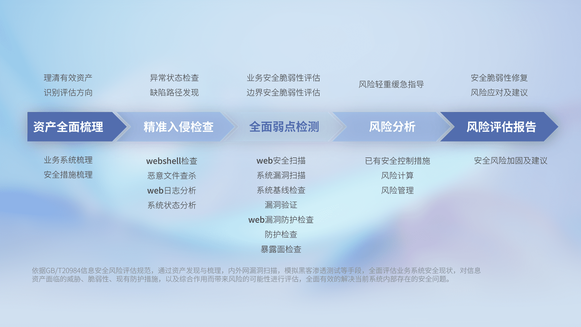 针对客户行业特性,,,以专业的安全服务+多厂商联合解决方案提供专属的一站式安全管理服务,,,,帮助客户全面感知网络空间威胁,,基于识别、、检测、、、、分析、、、防护、、、监测、、响应的服务理论模型,,,,从方案咨询、、、集成交付、、、评估验证、、、、优化加固、、运维运营,,,致力于为客户提供完整的闭环管理式安全服务。。以实战经验为客户打造高抵御风险的安全体系,,,帮助客户发现威胁、、对抗威胁、、处置威胁,,不断积累安全对抗能力,,,持续保障数字化安全。。